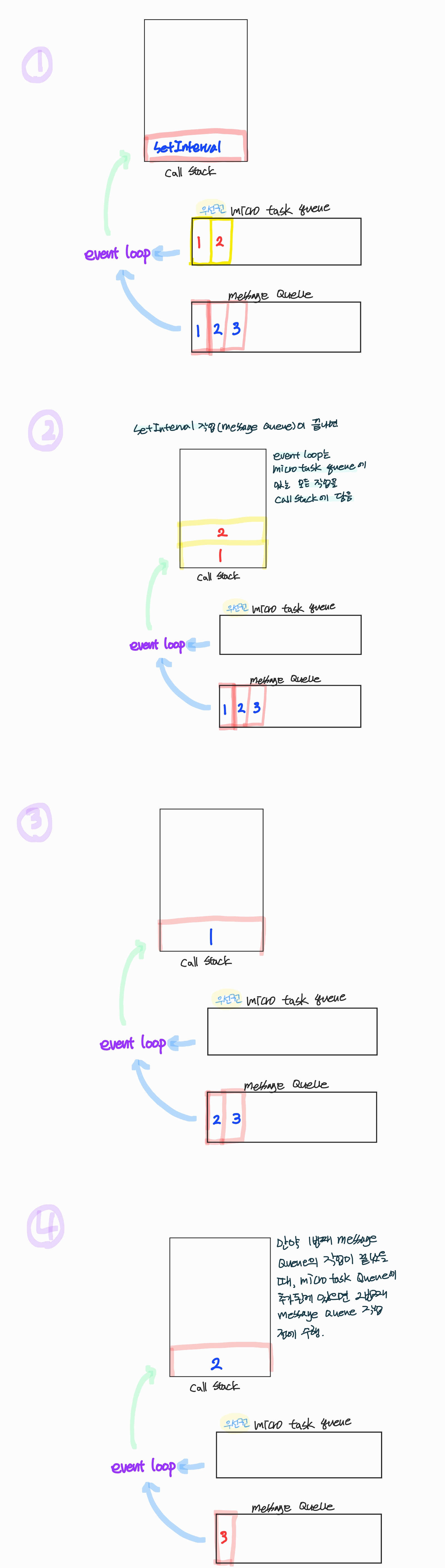 마이크로태스크큐 메시지큐 작업종류 프로미스의 콜백(then, catch, finally), mutationObserver의 콜백 등 setTimeout, setInterval, 이벤트 핸들러(클릭, 키보드 이벤트)와 같은 비동기 작업이 메시지 큐에 포함됨. 실행시점 현재 실행중인 스크립트나 메시지큐의 작업이 완료된 직후 다음 메시지큐가 처리되기 전에 마이크로태스크 큐의 모든 작업이 실행됨. 마이크로태스크 큐가 비어있을 때까지 마이크로태스크가 연속해서 실행됨을 의미함. 이벤트 루프가 메시지 큐를 확인하여 콜 스택이 비어있을 때 큐의 첫번째 작업을 콜스택으로 이동시키고 실행함. 한 작업이 처리되면 이벤트 루프는 다시 큐를 확인하여 다음 작업을 처리함. - 마이크로태스크는 메시지 큐에 있는 매크로 태스크보다 우선 처리됨. 현재 실행중인 매크로태스크나 스크립트가 종료되고 나면 이벤트 루프는 메시지큐의 다음작업을 처리하기 전에 마이크로태스크큐의 모든 작업을 처리함.