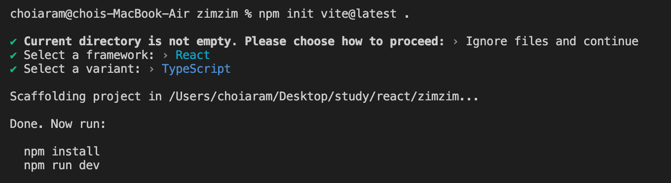 현재 폴더에 만들고 싶다면 명령어(npm init vite@latest) 뒤에 . 을 붙이면 된다.