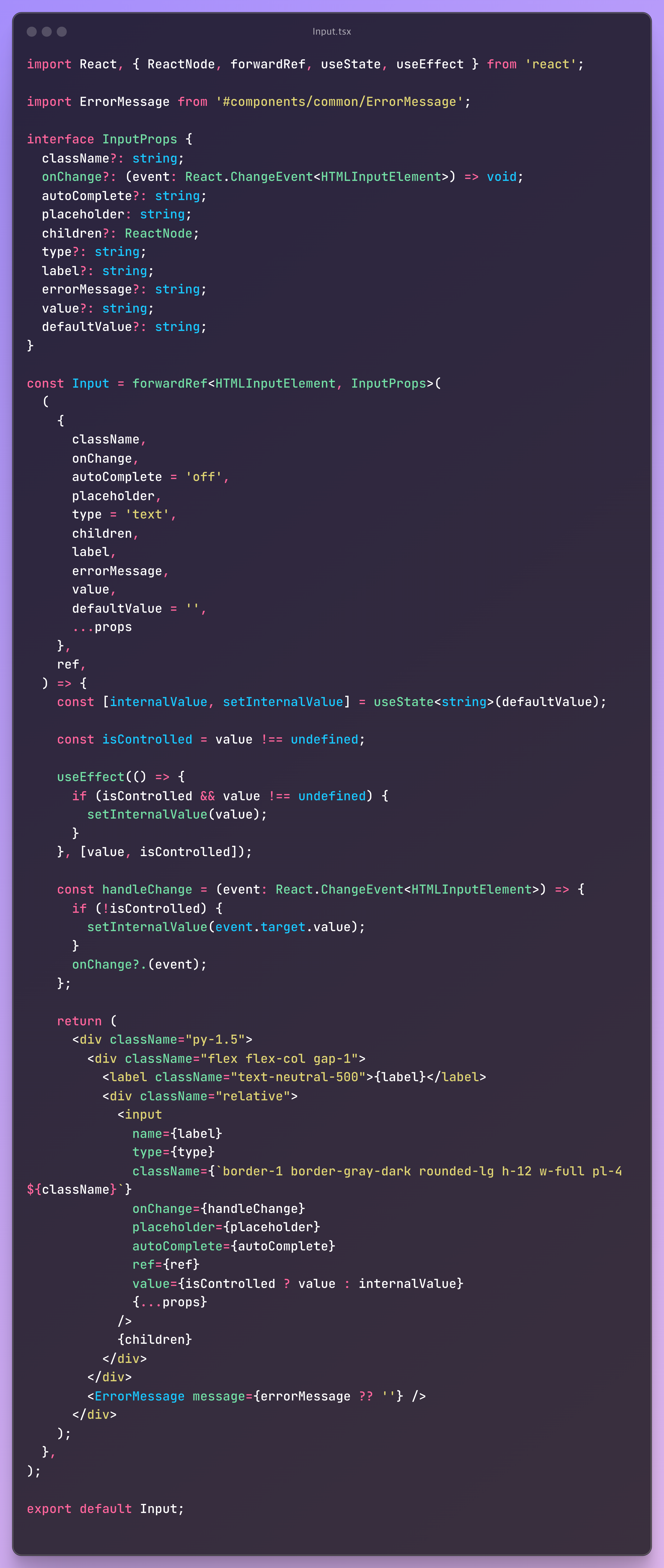 먼저 forwardRef를 통해 부모 컴포넌트에서 ref를 통해 input에 접근할 수 있게 하며 props들을 받아 폼 필드의 동작을 제어할 수 있게 만들었다. props 중 value는 controlled componet 방식을 사용할 때 입력 필드 값이며 defaultValue는 uncontrolled component 방식을 사용하는 초기값이다.
