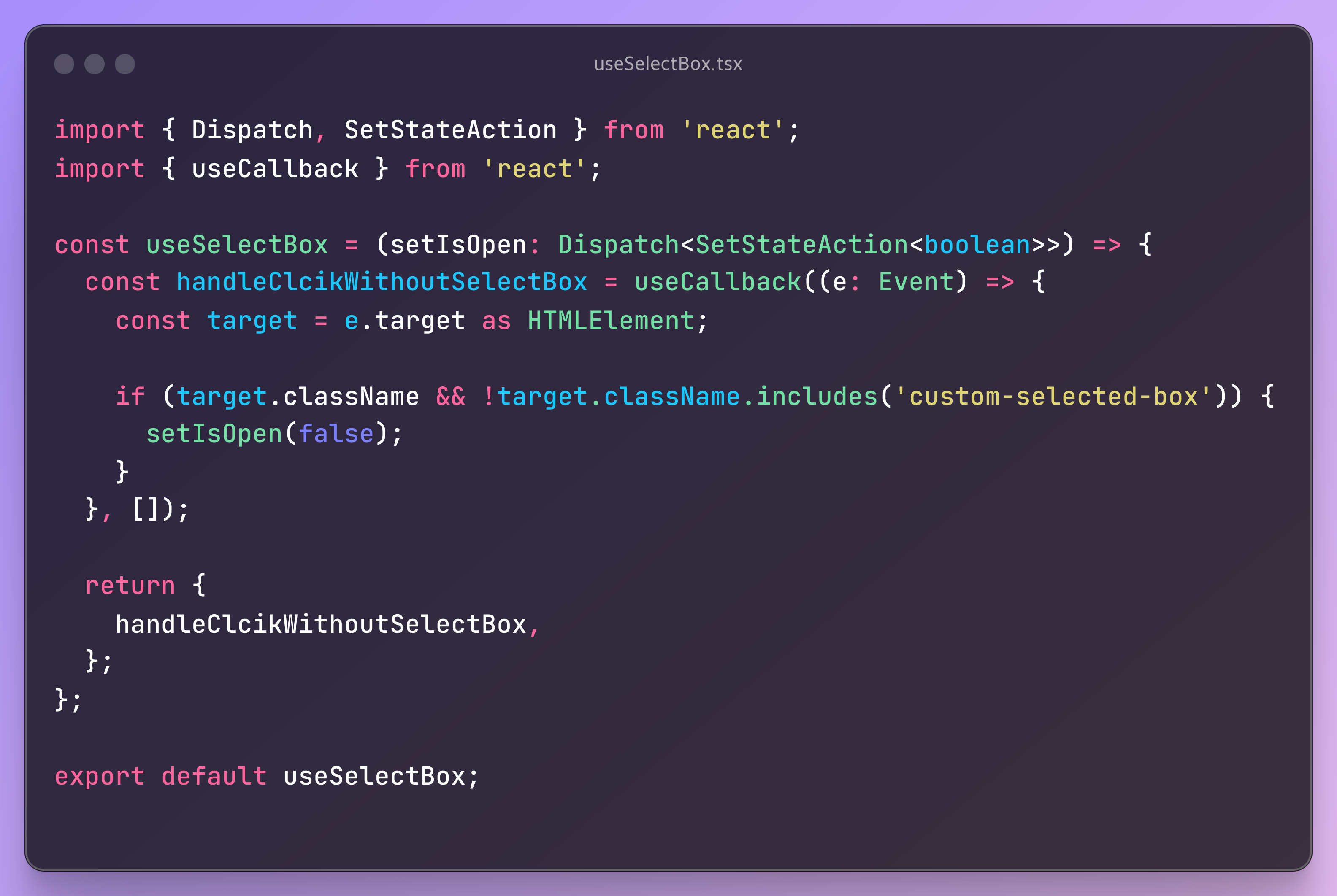 사용자가 select box를 제외한 다른 영역을 클릭했을 때 select box가 사라지도록 만들어야 했다. 그래서 useCallback과 addEventlistener로 훅을 useSelectbox 커스텀 훅을 만들었다.