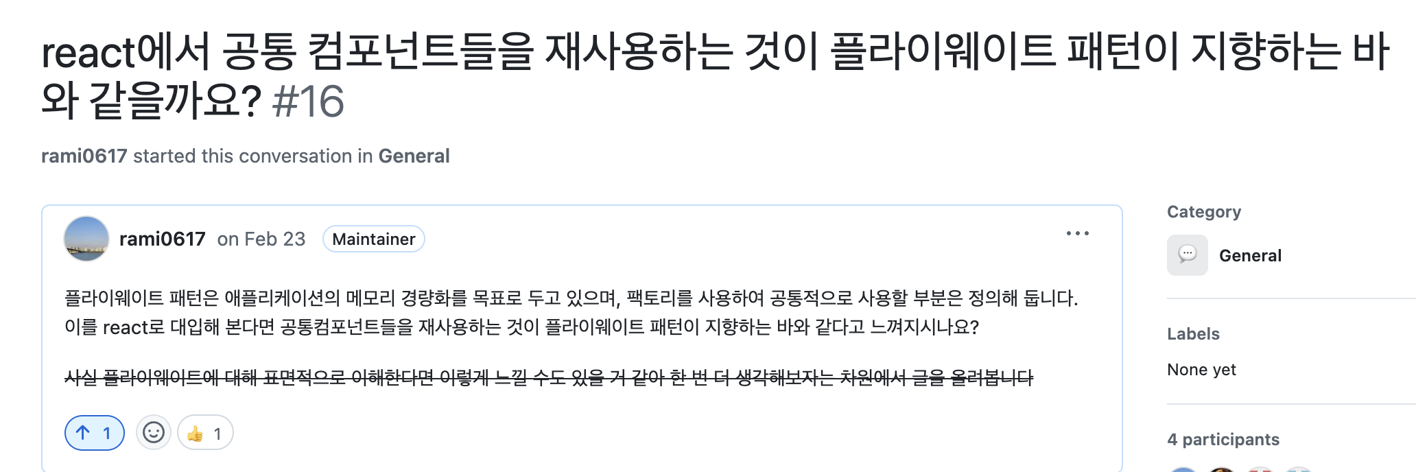 자바스크립트와 리액트를 실무에서 숨 쉬듯이 사용하지만, 사용할 때 우리가 어떤 디자인 패턴을 사용하는지 전혀 알지 못했기 때문에 이런 의문점들을 해결하기 위해 공부하게 되었습니다. 주로 점심시간에 시간을 잠시 내어 책을 읽고 정리를 하고 그 안에서 원래 알고 있던 지식들과 연결해 생각하려고 노력했습니다. 모임이 아닌 날 서로의 의견을 알고 싶을 때는 깃허브에 디스커션을 활용하였습니다.